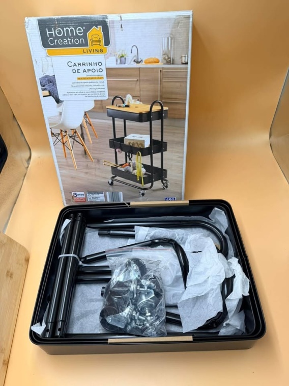 Praktyczny, metalowy wózek na kółkach z trzema półkami. Idealny do przechowywania i transportowania różnych przedmiotów w domu lub biurze. Solidna konstrukcja i mobilność zapewniają wygodę użytkowania.